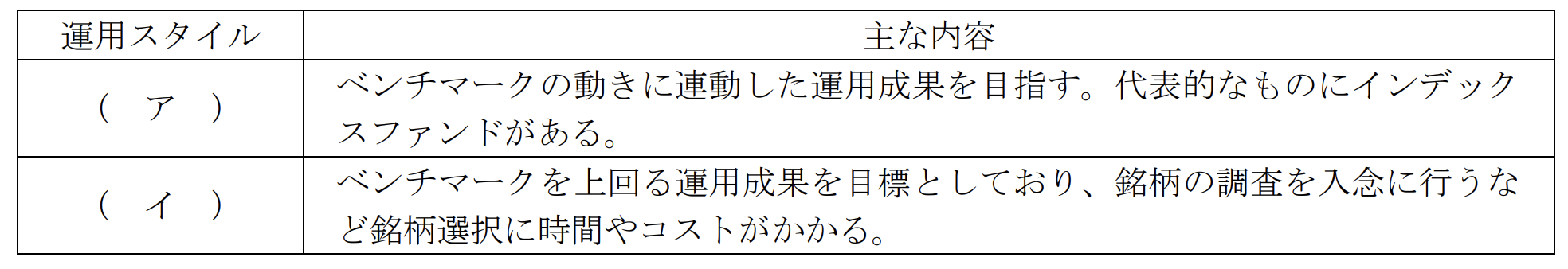 金融資産運用実技2024年5月問7投資信託_ポートフォリオ理論・デリバティブFP3級 2024年5月 実技 問7投資信託の運用スタイルに関する下表の空欄(ア)、(イ)にあてはまる語句の組み合わせとして、最も適切なものはどれか。 A(ア)バリュー運用 (イ)グロース運用B(ア)パッシブ運用 (イ)アクティブ運用C(ア)バランス運用 (イ)グロース運用