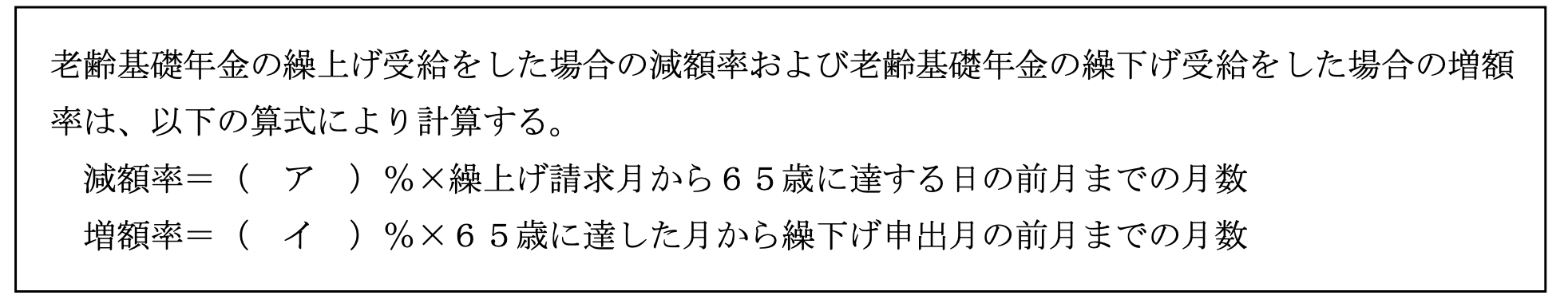 ライフプランニング実技2025年5月問5老齢基礎年金・厚生年金FP3級 2025年5月 実技 問5浦田豊和さん(61歳)は、老齢基礎年金の繰上げ受給および繰下げ受給について、FPの堀尾さんに質問をした。豊和さんの老齢基礎年金の繰上げ受給および繰下げ受給に関する次の記述の空欄(ア)、(イ)にあてはまる数値の組み合わせとして、最も適切なものはどれか。なお、記載のない事項については一切考慮しないこととする。 A(ア)0.7 (イ)0.4B(ア)0.4 (イ)0.7C(ア)0.5 (イ)0.5