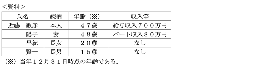 タックスプラン実技2025年5月問16所得控除_配偶者控除・扶養控除FP3級 2025年5月 実技 問16会社員の近藤敏彦さんの生計を一にしている家族に関するデータは下記<資料>のとおりである。敏彦さんの当年分の所得税における扶養控除額として、正しいものはどれか。なお、<資料>に記載のあるデータ以外の扶養控除の要件はすべて満たしているものとする。 A38万円B63万円C76万円